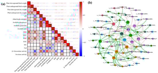 Pearson correlation analysis (Figure 4a) revealed significant positive correlations between soil pH and available P, available K, and β-glucosidase activity. Moreover, SOC demonstrated significant positive correlations with the aboveground weight of Lolium perenne L., particulate organic carbon, and invertase activity. As illustrated in Figure 4b, the co-occurring network analysis revealed significant negative correlations between soil pH and Chloroflexales and Sphingomonadales. A significant negative correlation between SOC and Myxococcales was also revealed.