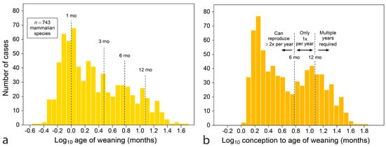A large compendium of life-history data [59] allows sweeping views of maternal adaptations. Figure 1a displays a histogram of the age of weaning for 743 nonvolant placental (NVP) mammals, about 20% of species recognized at the time it was assembled [60]. Nursing is commonly short in duration, with a mode near one month. Even with the inclusion of some large marine mammals, few species nurse beyond 12 months.