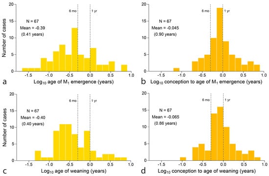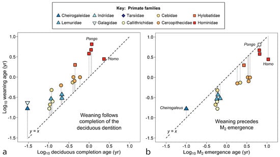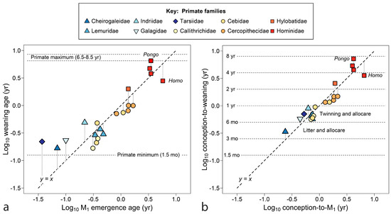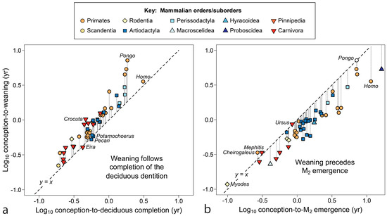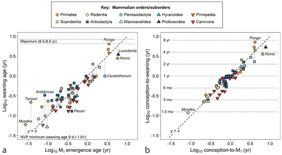 A previous study showed that the emergence of the mandibular first permanent molar (M1) is highly correlated with a series of life-history traits in primates [17]. For these well-studied mammals, M1 emergence appeared to be nearly equivalent to weaning [21,22,23], although the relationship has been questioned and exceptions noted [24,25]. The present study reconsiders the relationship of tooth emergence to weaning by first examining the fine-grained and high-quality data for primates [26,27] to generate hypotheses, and second by testing hypotheses against all data for placental mammals, observing commonalities and noting when exceptions are revealing. The results increase our understanding of growth and development of living mammals and should lead to more dynamic inferences about the life history of extinct species, because estimates for age of tooth emergence are often recoverable in the fossil record [23,28,29,30,31,32,33,34].