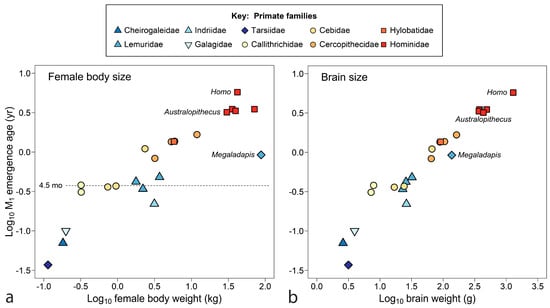 Primates: Table 1 compiles ages of tooth emergence and other aspects of life history for 22 species in ten families of living primates, adding two extinct species for which age of emergence of M1, body weight and brain weight have all been reconstructed. One genus, Macaca, appears twice to give an example of intrageneric similarity. Note that female body weights are used for primates, whereas comparisons across all 71 placental species use an estimate of overall species weight (where sex-specific weights are not always available).
