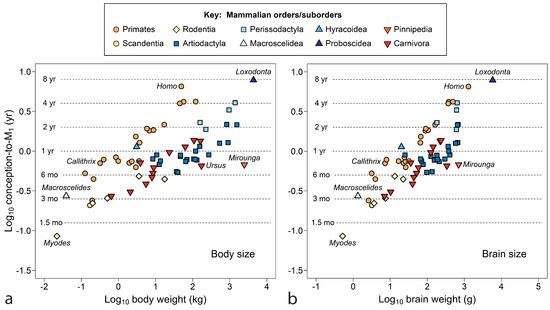 - Sacher, G.A.; Staffeldt, E.F. Relation of gestation time to brain weight for placental mammals: Implications for the theory of vertebrate growth. Am. Nat. 1974, 108, 593–615. [Google Scholar] [CrossRef]