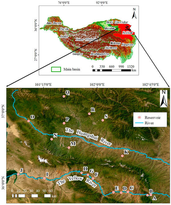 The research area (Figure 1) is located in the northeastern Qinghai Plateau (100°72′ E–102°75′ E, 35°83′ N–37°20′ N), encompassing 10 reservoirs on the main stream of the Yellow River (A: Dahejia, B: Jishixia, C: Huangfeng, D: Suzhi, E: Gongboxia, F: Kangyang, G: Zhiganglaka, H: Lijiaxia, I: Nina, and J: Longyangxia), as well as 8 reservoirs in the tributary (the Huangshui River) of the Yellow River (K: Shengjiaxia, M: Dananchuan, N: Pandao, O: Dongdatan, P: Yunguchuan, Q: Heiquan, R: Nanmenxia, and S: Zanzha). It is a transitional zone from the Loess Plateau to the Qinghai Plateau and also the boundary zone between China’s first- and second-order terrain. The area consists of low-altitude river valleys (elevation 1600–2700 m) interspersed with high-altitude mountains (elevation 3000–5000 m), with an overall terrain characterized by high in the west and low in the east. The climate type belongs to a typical plateau continental climate with an annual average temperature of about 5 ℃ and an annual average precipitation of about 360 mm. This area has many cliffs and wide valleys which are strongly affected by intense seismic activity, leading to frequent occurrences of landslides and debris flow. The soil types mainly include chestnut soil, cold desert soil, gray cinnamonic soil, etc., [23]. There are numerous deserts on both sides of the upper Yellow River with sand being dominant sediments in the floodplains. Frequent agricultural activities along the banks of the Huangshui River have a significant impact on the water quality of reservoirs and the physical and chemical properties of sediments [24]. The excessive construction of reservoirs in the northeastern Qinghai Plateau has to some extent altered the hydrological characteristics and microbial community structure of rivers, affecting natural ecological processes [25].