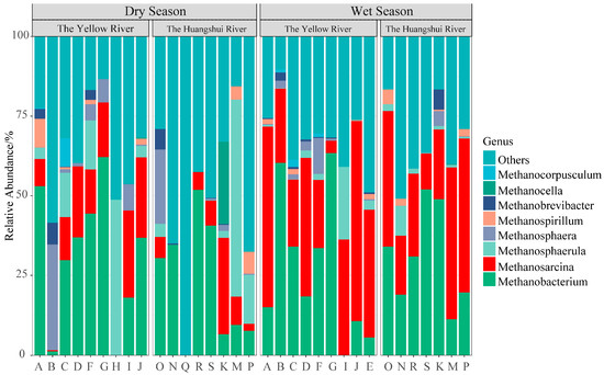 At the genus level (Figure 2), the relative abundance of methanogens at the genus level, with the top eight genera listed (the remaining grouped as “Other”), included Methanobacterium (28.87%), Methanosarcina (21.67%), Methanosphaerula (6.53%), Methanosphaera (3.24%), Methanospirillum (1.17%), Methanobrevibacter (0.98%), Methanocella (0.80%), and Methanocorpusculum (0.41%). Temporally, during the dry season, Methanobacterium was the dominant genus, while during the wet season, Methanosarcina took over as the dominant genus. Spatially, in the Yellow River basin, the dominant genus was Methanosarcina, whereas in the Huanshui River basin, it was dominated by Methanobacterium.