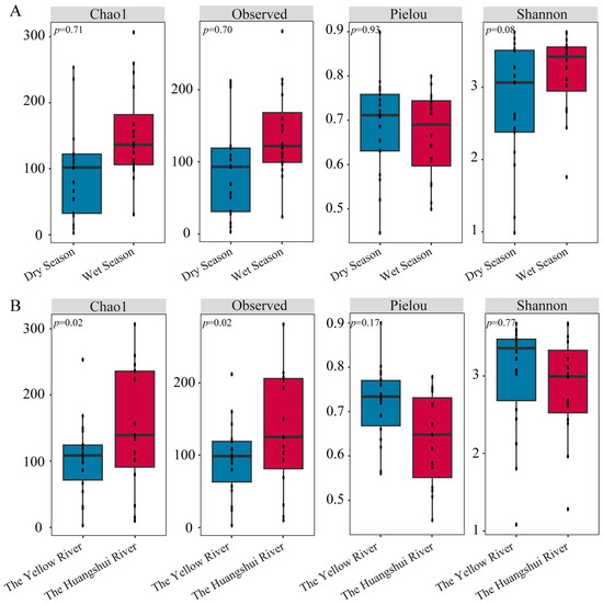 Alpha diversity of methanogens in different seasons (A) and basins (B).