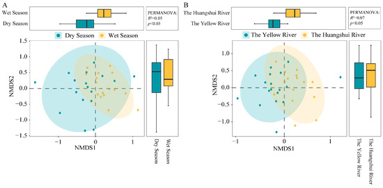 To further demonstrate the diversity of species in the samples, non-metric multidimensional scaling (NMDS) based on the Bray–Curtis distance at the OTU level was used to show the differences between different samples. The NMDS ordination plot showed an overlap in the methanogenic communities between different seasons and river basins. There is a larger overlap between methanogenic communities in different seasons, indicating a higher similarity, with the most densely distributed methanogenic community during the wet season (Figure 4). Permutational multivariate analysis of variance (PERMANOVA) based on distance matrices revealed significant differences in β-diversity of methanogenic communities among different seasons and river basins in sediment samples from reservoirs on the northeastern Qinghai Plateau (p < 0.05) (Figure 4A,B).