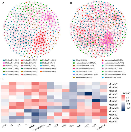 Figure 5C illustrates the influence of environmental variables on the modules of methanogens in the co-occurrence network. Modules 1 and 10 show negative correlations with Area, sT, wT, T, wTOC, and Precipitation, while modules 2, 6, 7, 8, and 12 exhibit positive correlations with these variables. Additionally, modules 3 and 5 are positively correlated with wTN, sOC, sTN, wpH, and elevation, whereas modules 6 and 11 are negatively correlated with these variables. Module 8 demonstrates positive correlations with most environmental parameters while module 4 shows negative correlations. Furthermore, module 9 is positively associated with sT, wT, T, wTOC, Precipitation, sTP, wTP, sOC, and wpH, but negatively related to Area, spH, wTN, sTN, and elevation.