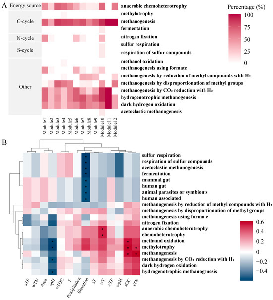 FAPROTAX function prediction of methanogens. (A) Methanogenic active groups. (B) Correlation of environmental factors and active groups. The asterisk indicates significance at a p < 0.05 level.