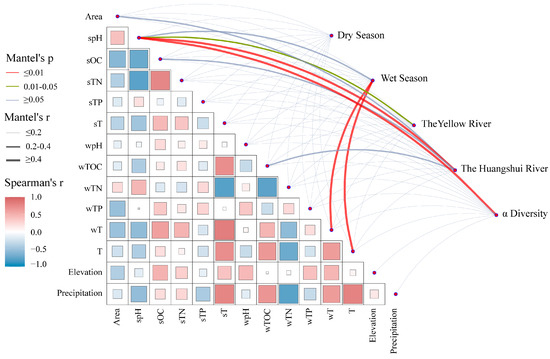 Relationship between methanogenic community and α diversity and environmental factors. The size of the boxes in the lower left panel represents the magnitude of the correlation between environmental factors, while the color indicates whether the correlation is positive or negative. The upper right panel shows the relationship between community composition and methanogenic diversity with environmental factors across different seasons and basins. The color of the lines represents the significance level, and the thickness indicates the strength of correlation with environmental factors.