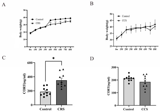The influence of chronic stress on body weight and serum corticosterone level of mice. (A,B) show the effect of chronic restraint stress (CRS, n = 10) and chronic cold stress (CCS, n = 10) on body weight of mice. (C,D) show the effect of CRS and CCS on serum corticosterone level of mice. * indicates p < 0.05 and ** indicates p < 0.01.