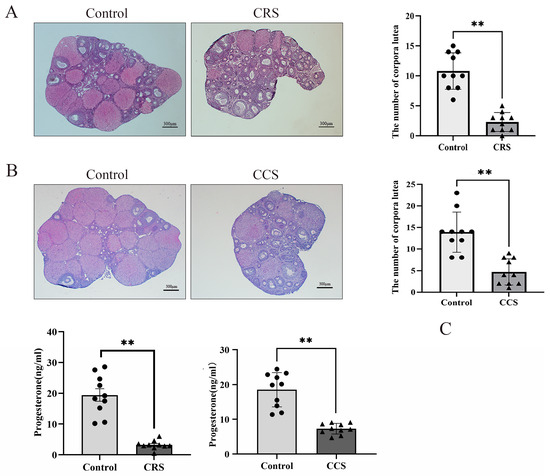 The influence of chronic stress on the number of corpora lutea and the serum progesterone of mice. After establishing the chronic stress model, HE staining was used to detect the pathological changes in ovarian tissues. (A) shows the effect of chronic restraint stress (CRS) on the number of corpora lutea of mice. (B) shows the effect of chronic cold stress (CCS) on the number of corpora lutea of mice. (C) shows the effect of CRS and CCS on the serum progesterone level of mice. ** indicates p < 0.01. Scale bar = 300 μm.