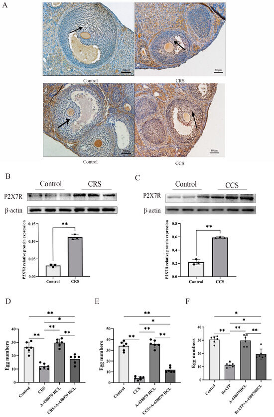 The expression of P2X7R in ovaries of chronic stress mice and the influence of P2X7R signaling on the ovulation of mice. After establishing the chronic stress model, immunohistochemistry and Western blotting were used to examine the expression change of P2X7R in ovarian tissues. (A–C) show the effect of chronic restraint stress (CRS) and chronic cold stress (CCS) on the expression of P2X7R in ovarian tissues. Superovulation was used to assess the ovulation rate of mice. (D,E) show the effect of A-438079 HCL, an antagonist of P2X7R signaling, on the superovulation rate of CRS and CCS mice. (F) shows the effect of BzATP and A-438079 HCL on the superovulation rate of normal healthy mice. * indicates p < 0.05 and ** indicates p < 0.01. Scale bar = 80 μm. The uncropped western blot figures were presented in Figures S1 and S2.
