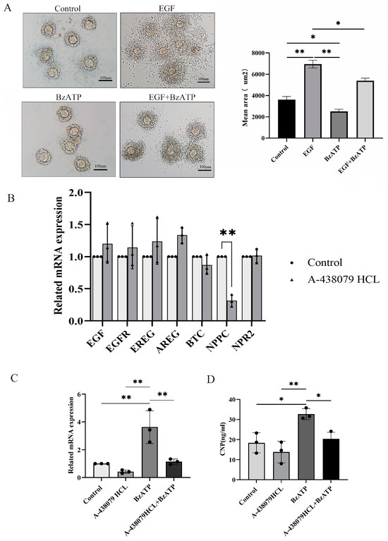 The 21 day-old Kunming female mice (n = 6) were intraperitoneally injected with 5 IU PMSG. After 46 h, the ovaries were punctured under a stereomicroscope with sterile 27-gauge needles. COCs were picked up and washed twice in preheated culture medium, by oral pipette. The COCs were cultured in a 50 µL drop covered with paraffin oil. The culture media included MEM-ALPHA, 5% FBS, 20 mM sodium pyruvate, 3 mg/mL BSA, 100 IU/mL penicillin and 100 IU/mL streptomycin. The experiment grouping included the control group, the 10 ng/mL EGF group, the 100 µM BzATP group and the 10 ng/mL EGF + 100 µM BzATP group. The cumulus expansion was observed after treatment with indicated reagents for 18 h. COCs were photographed with an inverted microscope, and the area of cumulus expansion was measured using Image J 2.15.0 software to evaluate the cumulus expansion.