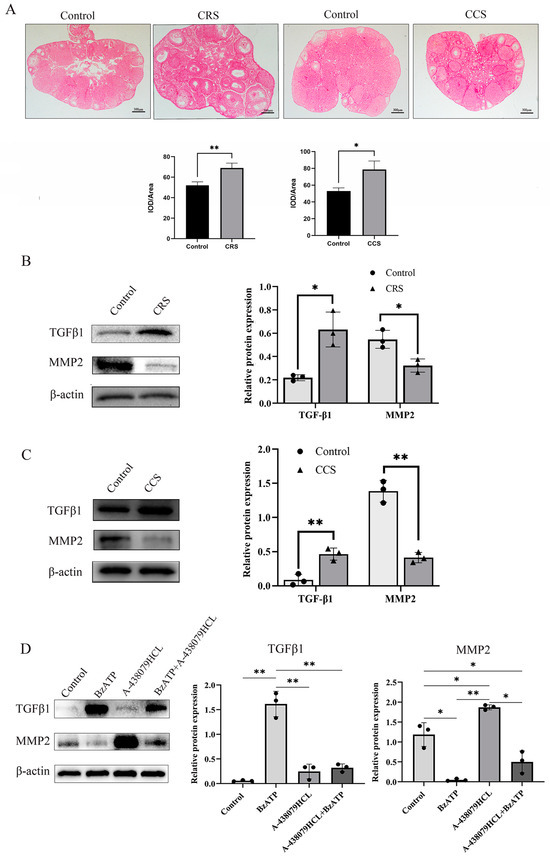 The influence of chronic stress on ovarian fibrosis. The changes in tissue fibrosis were detected by sirius red staining. (A) shows the representative sirius red staining of ovary in the control, chronic restraint stress (CRS) and chronic cold stress (CCS). (B) shows the expression of fibrosis-related factors, including TGF-β1 and MMP2 in chronic restraint stress (CRS) mice. (C) shows the expression of TGF-β1 and MMP2 in chronic cold stress (CCS) mice. (D) shows the effect of BzATP and A-438079 HCL on TGF-β1 and MMP2 expression in granulosa cells. * indicates p < 0.05 and ** indicates p < 0.01. Scale bar = 300 μm. The uncropped western blot figures were presented in Figures S3–S5.