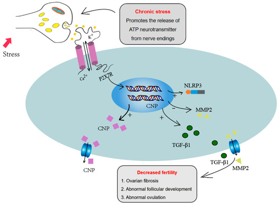 In conclusion, these results demonstrated that P2X7R expression was increased in ovaries of chronic restraint-stress and chronic cold-stress mouse models. The increased P2X7R signaling influenced cumulus expansion and the ovulation process through regulating NPPC expression. The increased ovarian fibrosis induced by P2X7R may also contribute to the abnormal ovulation of the chronic stress mouse model.