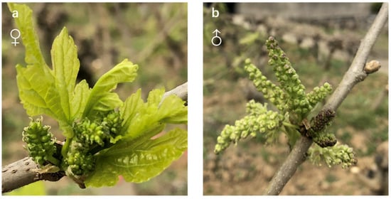 The flower buds were collected from the trees of two M. alba purified breeding lines, three BaiTiao (BT), which produces only male flowers, and three Y20 which produces only female flowers []. These breeds are grown at the Sericulture Research Institute of the Chinese Academy of Agricultural Sciences in Zhenjiang, Jiangsu Province, China (N 32°11′45.80″, E 119°23′45.80″). Maintenance conditions for the M. alba tree are as follows: minimum and maximum temperatures (9–20 ℃), relative humidity (40–60%), irrigation (rainfall), day length (12 h), and light intensity (15,000 lx). Additionally, information about the appearance conditions of the trees includes age (5 year), diameter (5 cm), and height (2 m). BT and Y20 have characteristics such as larger inflorescences, a greater number of flowers, and wide adaptability and are typical cultivars of M. alba. Therefore, these two purified lines were used as the study materials to compare the differences in gene expression between male and female inflorescences of M. alba. Male and female inflorescence (1.3 m from the ground) samples were collected (that is, male inflorescence from BT purified lines and female inflorescence from the purified Y20 lines). The samples were a mixture of different inflorescences from the same plant, and six trees (3 from BT and Y20 each) were selected for sampling, representing three biological replicates. In all, a total of six catkins were sampled. Inflorescence sampling was conducted from 9:00 p.m. to 11:00 p.m. Only fully developed adult catkins (0.8–1.5 cm long and 0.3–0.5 cm in diameter) were collected, when the catkins were fully expanded, but before the flowers had opened (Figure 1). Whole catkins were cut and immediately frozen in liquid nitrogen for RNA extraction.