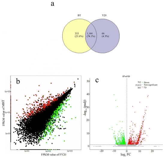 Six libraries were subjected to Illumina sequencing utilizing samples from male and female flower buds. Each sample was prepared in three repetitions. A combined sum of 305,642,716 raw sequencing reads were acquired from the flower buds of BT (male) and Y20 (female). After trimming adapter and poor-quality sequences, 294,445,006 clean reads were obtained. Among these reads, 139,671,832 (95.6%) were clean reads from male flower buds and 154,773,174 (97.0%) were clean reads from female flower buds. For all the libraries, the average Q30 was more than 92% and the GC content was more than 40% (Table 1). Furthermore, more than 64.5% of the clean reads were mapped to the reference genome (M. notabilis). A total of 21,155 unigenes were obtained from the assembly, with the longest gene being 16,567 bp and the shortest having 72 bp.