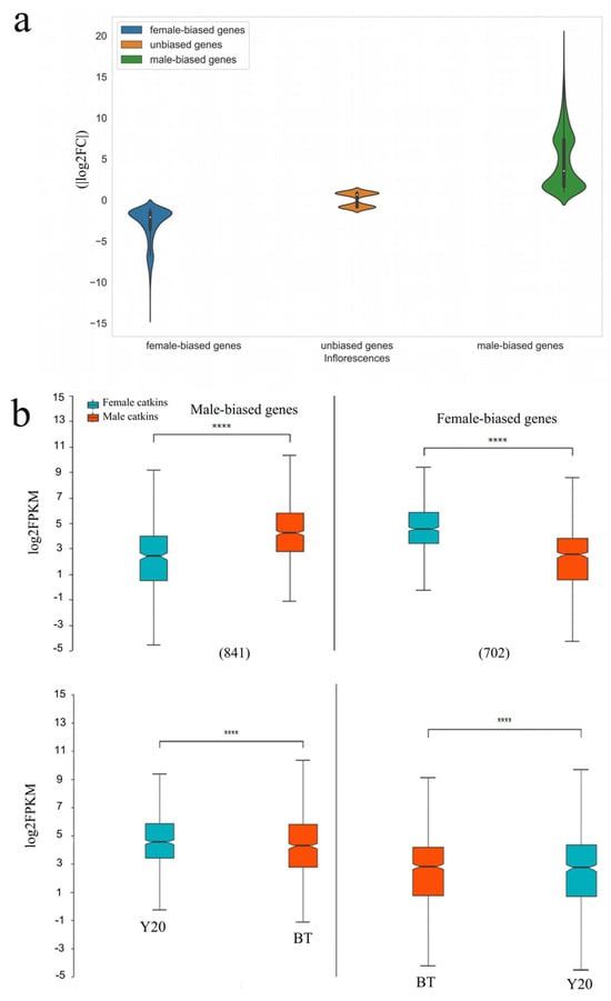 To obtain clean RNA-seq data, the raw RNA-seq reads from each sample were processed using in-house perl scripts to trim adapters and low-quality bases from the ends of the reads, with further filtering of reads containing poly-N. The clean, high-quality reads for each sample were then mapped to the M. notabilis reference genome [] using Hisat2 v2.0.5, and the mapped reads were assembled using StringTie (v1.3.3b) for novel transcript prediction. Fragments per kilobase million (fPKM) was used to estimate gene expression levels from each gene according to the number of reads mapped to that gene region using featureCounts v1.5.0-p3. Differential expression analysis was performed to detect the significantly differentially expressed genes (DEGs) between the male and female catkins using the DESeq2 R package (v1.16.1) []. Furthermore, p-values were adjusted based on the false discovery rate (FDR) using the Benjamini and Hochberg approach. Genes with a fold change difference in expression (|log2(FoldChange)| > 0) or (|log2(FoldChange)| < 0) and adjusted p-values (p-adj) < 0.05 were considered as DEGs. Among these DEGs, the value of (|log2(FoldChange)| > 0) was defined as male-biased genes and (|log2(FoldChange)| < 0) as female-biased genes. The extremes were considered as genes expressed only in females and were defined as female-limited genes, and the opposite was defined as male-limited genes. Gene ontology (GO) enrichment analysis was performed on the DEGs using the ClusterProfiler R package []. GO terms with padj < 0.05 were considered significantly enriched by DEGs. The ClusterProfiler R package was also used to perform DEG enrichment statistics in the KEGG pathway []. Pop_tri_v3 (Populus trichocarpa) was used as a reference (https://plants.ensembl.org/Populus_trichocarpa/Info/Index, accessed on 15 October 2023).