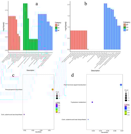 Functional analysis of the DEGs in M. alba male and female catkins. (a) GO enrichment terms of male-biased expression genes. (b) GO enrichment terms of female-biased expression genes. (c) KEGG-enriched differential expression genes of male-biased expression genes. (d) KEGG-enriched differential expression genes of female-biased expression genes. BP; biological process. CC; cellular component. MF; molecular function.