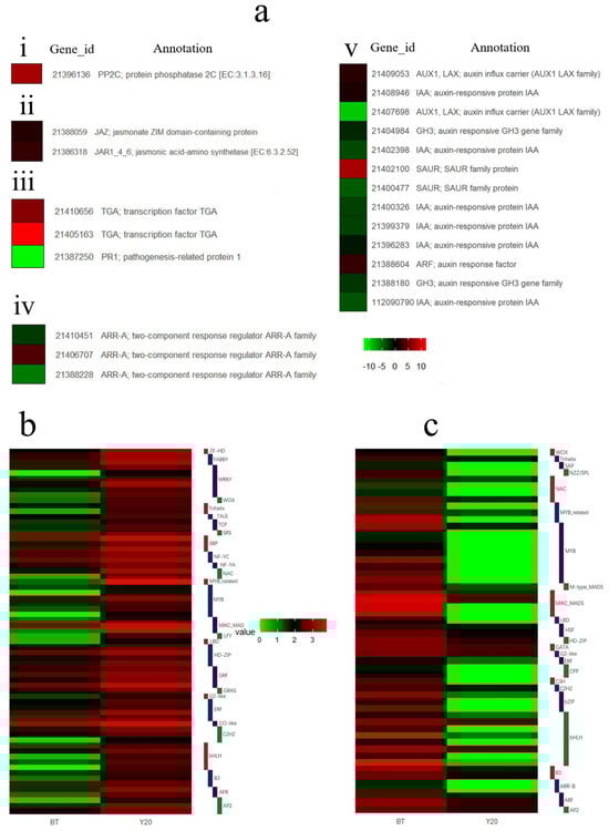 A heat map analysis of the DEGs in M. alba male and female catkins. (a) A heat map diagram of the DEGs between male and female flower buds of M. alba in the phytohormone signaling pathways: abscisic acid (i), jasmonic acid (ii), salicylic acid (iii), cytokinin (iv), and auxin (v). (b) The transcription factor (TF) families differentially expressed in male-biased genes. (c) The TF families differentially expressed in male-biased and female-biased genes. The color scale represents the log10-transformed FPKM value. The sex-biased genes mentioned here include sex-limited genes. The male-biased genes are upregulated and female-biased genes are downregulated based on the figure legend.
