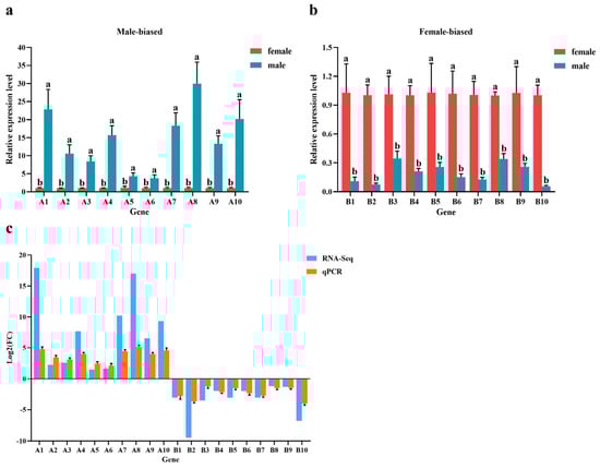 To confirm the reliability of the RNA-seq data, 20 female- or male-biased unigenes annotated for defense-related pathways and growth and development pathways, respectively, were randomly selected for performing real-time quantitative PCR, including 10 (9 + 1) male-biased genes and 10 (9 + 1) female-biased genes (Figure 6; Table 2). Although the expression values were different between RT-qPCR and RNA-seq, the expression patterns of the genes were consistent with RNA-seq. The male-biased genes were significantly upregulated in males and downregulated in females and vice versa (p ≤ 0.05).