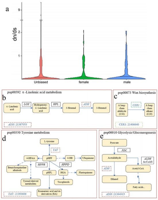 To further discuss the situation of extreme values of dN/dS in sex-biased genes and unbiased genes, we calculated and compared the distribution of the upper 95% quantiles of 5000 random bootstrap samples of unbiased genes and the upper 95% quantile of dN/dS of sex-biased genes. The results show that the upper 95% quantiles for the sex-biased genes (9.8876) exceeded the quantiles from the bootstrap sampling (3.721–5.039), suggesting that sex-biased genes were more likely to enrich the maximum dN/dS than unbiased genes. Remarkably, a total of 18 DEGs (5 female-biased genes (4 + 1) and 13 male-biased genes (10 + 3)) under positive selection (dN/dS > 1) were screened (Table S2), and only 6 DEGs were enriched in 18 KEGG pathways (Table S3). These included one female-biased gene enriched in cutin, suberine, and the wax biosynthetic pathway (pop00073) and four male-biased genes mainly enriched in the synthesis and metabolism of multiple amino acids and secondary metabolites, including glycolysis/gluconeogenesis (pop00010), tyrosine metabolism (pop00350), α-Linolenic acid metabolism (pop00592), and phenylpropanoid biosynthesis (pop00960) (Figure 7b).
