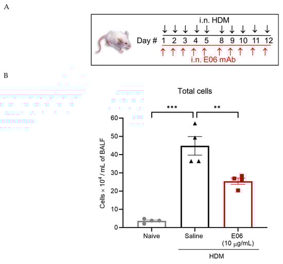 As detailed previously, 8–10-week-old BALB/c mice were subjected to repeated intranasal HDM, five days sequential days each week for two weeks [39,40]. For this purpose, individual mice were anesthetized with isoflurane (Forane, Baxter, Deerfield, IL, USA), then administered 25 μg of HDM (in 35 µL of saline) by intranasal instillation (i.n.). The HDM dose (with 3278 130 EU/mg of protein) was selected based on our prior studies, and it is well-tolerated without other adverse health effects on mice [40,41]. Age-matched allergen-naïve animals received intranasal saline (35 µL). For treatment with E06 mAb, animals were administered antibody i.n. (10 µg in 35 µL of saline) 60 min before each HDM challenge, and the control animal received saline alone.