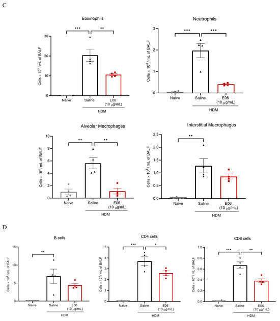 Each treatment group consisted of five animals for the positive control HDM challenge protocol, and four animals were included in the E06 treatment group. Depending on the experimental design, data were analyzed as described in the text using a t-test, one-way, or two-way ANOVA with Dunnett’s post hoc test using GraphPad Prism version 8.4.3 (San Diego, CA, USA). Data are shown as mean ± SEM unless otherwise specified. p < 0.05 was considered statistically significant.