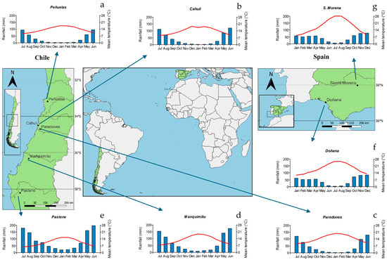 Site distribution showing the location of Pinus pinea stands and climate diagrams showing mean monthly temperature (red lines) and total monthly rainfall (blue bars) in Spain and Chile (both countries are shown in green). Abbreviations of sites (plantations): (a) CH1, Peñuelas (Chile); (b) CH2, Cahuil (Chile); (c) CH3, Paredones (Chile); (d) CH4, Manquimiliu (Chile); (e) CH5, Pastene (Chile); (f) SP1, Doñana (Spain); (g) SP2, Sierra Morena (Spain).