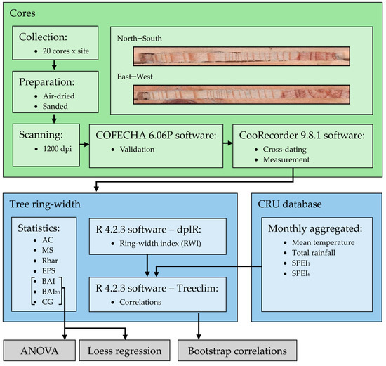 We used monthly 0.5°-gridded data from the Climate Research Unit dataset (CRU TS 4.03 [21]), which were collected from the Climate Research Unit Time-Series version 4.07 (CRU TS) climate dataset (https://crudata.uea.ac.uk/cru/data/hrg/cru_ts_4.07/cruts.2304141047.v4.07/, accessed on 10 November 2023). The monthly CRU climate data (mean temperature and total rainfall) were complemented and compared with rainfall data from the “Climate Hazards Group Infrared Precipitation with Stations” dataset [33]. We acknowledge that using local climate series may render more specific results regarding climate–growth relationships; however, the available local series were not comparable given their different lengths and data gaps. We used the 0.5°-gridded Standardized Precipitation Evapotranspiration Index (SPEI) downloaded from https://monitordesequia.csic.es/, (accessed on 10 November 2023) at scales of 1 (SPEI1) and 6 (SPEI6) months to characterize drought severity [34]. The SPEI is computed as a cumulative climatic water balance calculated at several temporal scales. Mean RWI series or chronologies were related to monthly climate data (mean temperature and total rainfall) and drought indices (SPEI1 and SPEI6) using the Treeclim R package [35] and reported as bootstrap correlation coefficients [36]. A summary of the methodological workflow is presented in Figure 2.