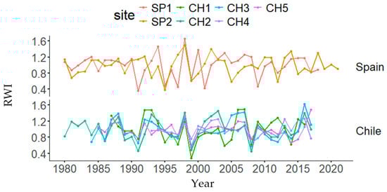 Tree-ring width index (RWI) changes by country (Spain and Chile) and site (Doñana, SP1; Sierra Morena, SP2; Peñuelas, CH1; Cahuil, CH2; Paredones, CH3; Manquimiliu, CH4; Pastene, CH5).