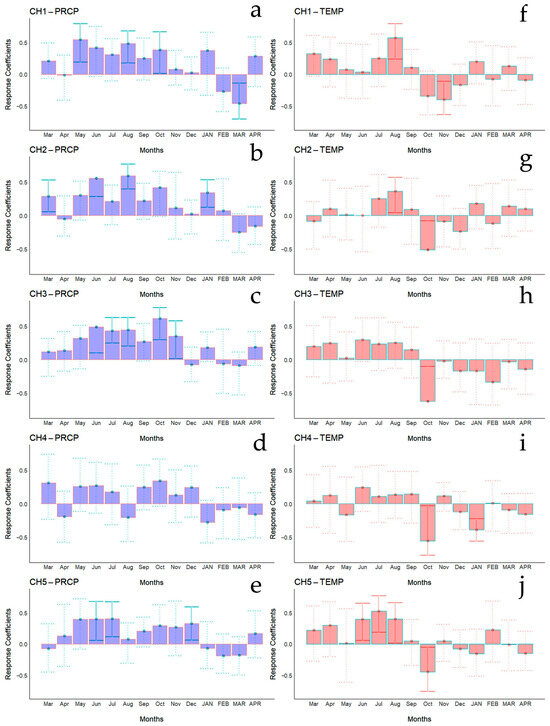 Bootstrapped correlations relating tree-ring width indices to monthly climate variables (PRCP, total rainfall—(a–e); Temp, mean temperature—(f–j)). Correlations were calculated from the previous March to the current April, and significant (p < 0.05) values are shown with continuous error lines. Chilean plantations: CH1 (Peñuelas), CH2 (Cahuil), CH3 (Paredones), CH4 (Manquimiliu), and CH5 (Pastene). Monthly climatic variables from the previous and current years are abbreviated with lowercase and uppercase letters, respectively.