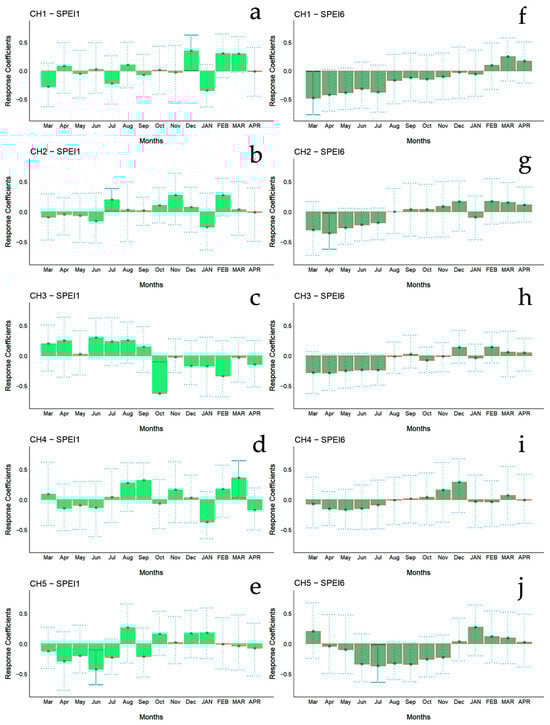 Bootstrapped response correlation analysis relating tree-ring width indices to SPEI calculated at one- (a–e) and six-month (f–j) temporal resolutions. Correlations were calculated from the previous March to the current April. Significant (p < 0.05) values are shown with continuous error lines. Chilean plantations: CH1 (Peñuelas), CH2 (Cahuil), CH3 (Paredones), CH4 (Manquimiliu), and CH5 (Pastene). Monthly climatic variables from the previous and current years are abbreviated with lowercase and uppercase letters, respectively.