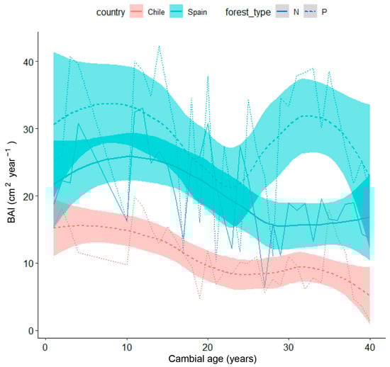 Loess Regression of the mean curves of site-grouped BAI according to tree age in stone pine in Spain (light blue lines and shaded areas) vs. Chile (pink lines and shaded areas). The shaded areas represent the higher and lower limits for the mean value of each forest type corresponding to each country. Abbreviations of forest type: N (solid line), natural; P, (dashed line) planted.