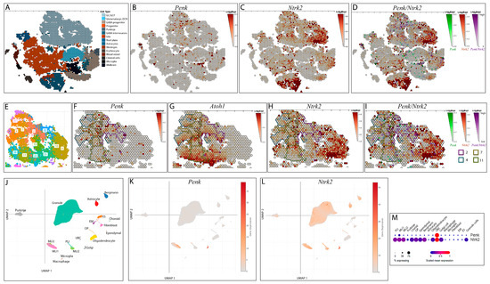 Publicly available single-cell and single-nucleus RNA-Seq datasets [11,12,21,31,32] were accessed at https://singlecell.broadinstitute.org/single_cell/study/SCP1300/ (accessed on 10 June 2024), https://singlecell.broadinstitute.org/single_cell/study/SCP795/ (accessed on 25 September 2023), https://cellseek.stjude.org/cerebellum/ (accessed on 12 August 2023), http://cotneyweb.cam.uchc.edu/E10_E17_shinyCell/ (accessed on 22 August 2023), and http://allexpsctl.spinalcordatlas.org/ (accessed on 26 June 2024). To generate the overlayed Penk and Ntrk2 expression images seen in Figure 1D,I, images of Penk expression (Figure 1B,F) and Ntrk2 (Figure 1C,H) expression were superimposed using Adobe Photoshop (v.2023). Photoshop was also used to generate the coloured borders around selected subpopulations, as seen in Figure 1F–I.