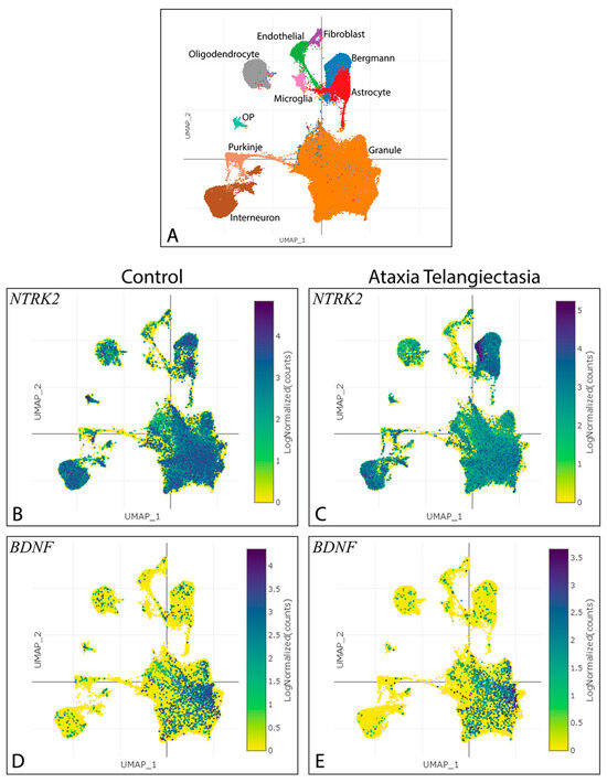 Expression of NTRK2 and BDNF in cerebella of patients with ataxia–telangiectasia and healthy controls through snRNA-Seq analysis. (A–E) UMAP visualisation of the publicly available snRNA-Seq dataset [11] from cerebellar vermis of adult patients with AT and healthy controls, coloured by cell identity (A), and log-normalised expression of NTRK2 (B,C) and BDNF (D,E). NTRK2 expression appears to be decreased specifically in the GCs of AT patients compared to those of healthy controls (B,C). BDNF expression does not appear to be particularly affected in any of the cell types of AT patients (D,E). Scaling is relative to each gene’s expression across all cells. OP—oligodendrocyte precursor.