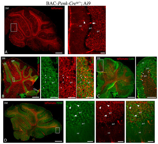 NeuN immunostaining revealed that only a subset of GCs expressed tdTomato in the adult cerebella of BAC-Penk-Cre mice. (A) Three-month-old representative sagittal cerebellar section of a BAC-Penk-Cretg/+;Ai9 mouse reveals that Cre-mediated tdTomato expression occurred primarily in the GC layer. The arrowhead and the arrow indicate tdTomato+ molecular layer interneuron and Purkinje cell, respectively. (B) NeuN immunostaining (green) on a sagittal cerebellar section of a 3 M BAC-Penk-Cretg/+;Ai9 mouse demonstrates that only a subset of GCs (yellow) undergoes Cre-recombination. Arrowheads indicate tdTomato+ GCs. (C) Calbindin immunostaining (green) on a representative sagittal cerebellar section of a 3 M BAC-Penk-Cretg/+;Ai9 mouse demonstrates that only a few PCs underwent Cre-recombination. Arrowheads indicate tdTomato+ PCs. (D) PENK immunostaining (green) on a sagittal cerebellar section of a 3 M BAC-Penk-Cretg/+;Ai9 mouse shows no PENK in the cerebellar GCs at this stage. Arrowheads indicate enkephalinergic tdTomato− Golgi cells. Scale bars: 500 μm in (A,B,D) and 50 μm in respective insets; 500 μm in (C) and 200 μm in the respective inset. gcl—granule cell layer, pcl—Purkinje cell layer, ml—molecular layer; CUL—culmen, SIM—simple lobule, and COPY—copula pyramidis.