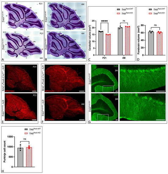The pattern of tdTomato expression was largely similar in the P21 and 4 M BAC-Penk-Cretg/+;Ai9 and TrkbPenk-KO;Ai9 mice (Figure 4E,F), suggesting that Ntrk2 deletion did not significantly affect the overall structure of the cerebellum.