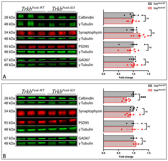 Molecular changes in TrkbPenk-KO cerebella. (A,B) Western blot analyses of calbindin and synaptic proteins in cerebellar lysates from 3 M (A) and 8 M (B) TrkbPenk-WT and TrkbPenk-KO mice. (A) At 3 M, calbindin levels were not affected in the cerebellum of TrkbPenk-KO mice, t(10) = 0.291, p = 0.777. Similarly, the synaptophysin levels in TrkbPenk-KO cerebella were not significantly different from those of controls, t(10) = 2.072, p = 0.065. The levels of other tested synaptic proteins were also not affected (PSD95, t(10) = 0.642, p = 0.535; GAD67, t(10) = 0.302, p = 0.769). Controls, n = 6, 3 males and 3 females; mutants, n = 6, 3 males and 3 females. (B) At 8 M, calbindin levels were significantly decreased in the cerebellum of TrkbPenk-KO mice, t(10) = 4.664, p < 0.001. There was no difference in the levels of the synaptic marker synaptophysin in the cerebellum of TrkbPenk-KO mice, t(10) = 1.197, p = 0.259, controls, n = 6, 1 male and 5 females; mutants, n = 6, 1 male and 5 females. The levels of PSD95 and GAD67 remained unchanged (PSD95, t(4) = 0.101, p = 0.925; GAD67, t(4) = 1.109, p = 0.330). Controls, n = 3, 1 male and 2 females; mutants, n = 3, 1 male and 2 females. *** p ≤ 0.001; ns, not significant (p > 0.05). Full Western blot figures can be viewed in Supplementary File S1.