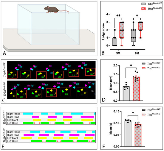 Motor coordination and gait were altered in TrkbPenk-KO mice at the early stage. (A) Illustration of a mouse performing the ledge test. (B) Ledge scores of 3 M and 8 M TrkbPenk-KO mice and controls, where 3 M mutants received significantly higher (worse) ledge scores than controls (Mann–Whitney U = 25.50, adjusted p = 0.005), suggesting a balance impairment. Controls, n = 13, 6 males and 7 females; mutants, n = 12, 7 males and 5 females. The difference persisted at 8 M (Mann–Whitney U = 28.00, adjusted p = 0.014). Controls, n = 9, 2 males and 7 females; mutants, n = 16, 6 males and 10 females. Different cohorts of animals were tested at 3 M and 8 M. (C) CatWalk footprints of a 3 M TrkbPenk-KO mouse and a 3 M control. (D) Print positions of left paws (distance between paws framed in red in (C)) were significantly elevated in 3–5 M TrkbPenk-KO mice, t(9.68) = 5.721, adjusted p = 0.015. Controls, n = 5, 2 males and 3 females; mutants, n = 9, 6 males and 3 females. (D) CatWalk gait diagrams of a 3 M TrkbPenk-KO mouse and a 3 M control. (F) Left hind swing (duration of no contact of the left hindpaw with the glass plate, indicated by red arrows in (E)) was significantly reduced in 3–5 M TrkbPenk-KO mice, t(11.74) = 4.823, adjusted p = 0.029. Controls, n = 5, 2 males and 3 females; mutants, n = 9, 6 males and 3 females. Individual paws are indicated by unique colours: right front, blue; right hind, pink; left front, yellow; left hind, green. LH—left hindpaw, LF—left frontpaw, RH—right hindpaw, and RF—right frontpaw. ** p ≤ 0.01, * p ≤ 0.05. Figure 6A was created with BioRender.com (accessed on 1 July 2024).