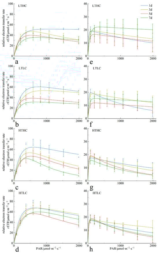 Changes in RLC of U. fasciata (a–d) and S. horneri (e–h) during cultivation in different conditions. Cultivation conditions for each group: LTLC (15 °C and 1000 μL·L−1), LTLC (15 °C and 400 μL·L−1), HTHC (20 °C and 1000 μL·L−1), and HTLC (20 °C and 400 μL·L−1). The error line is the SD.