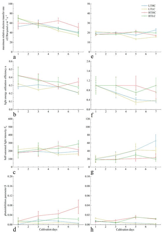 Changes in RLC-related parameters of U. fasciata (a–d) and S. horneri (e–h) during cultivation under different conditions. Cultivation conditions for each group: LTLC (15 °C and 1000 μL·L−1), LTLC (15 °C and 400 μL·L−1), HTHC (20 °C and 1000 μL·L−1), and HTLC (20 °C and 400 μL·L−1). The error line is the SD.