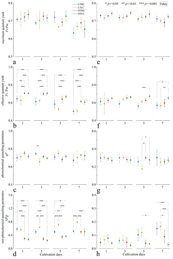 Changes in fluorescence induction parameters of U. fasciata (a–d) and S. horneri (e–h). Cultivation conditions for each group: LTLC (15 °C and 1000 μL·L−1), LTLC (15 °C and 400 μL·L−1), HTHC (20 °C and 1000 μL·L−1), and HTLC (20 °C and 400 μL·L−1). The error line is the SD.