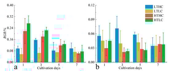 Changes in Relative Growth Rate (RGR) of U. fasciata (a) and S. horneri (b) during cultivation under different conditions. Cultivation conditions for each group: LTLC (15 °C and 1000 μL·L−1), LTLC (15 °C and 400 μL·L−1), HTHC (20 °C and 1000 μL·L−1), and HTLC (20 °C and 400 μL·L−1). The error line is the SD.