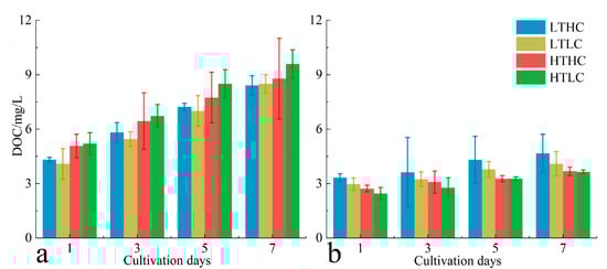 Changes in the release of dissolved organic carbon (DOC) from seawater during cultivation of U. fasciata (a) and S. horneri (b) under different conditions. Cultivation conditions for each group: LTLC (15 °C and 1000 μL·L−1), LTLC (15 °C and 400 μL·L−1), HTHC (20 °C and 1000 μL·L−1), and HTLC (20 °C and 400 μL·L−1). The error line is the SD.