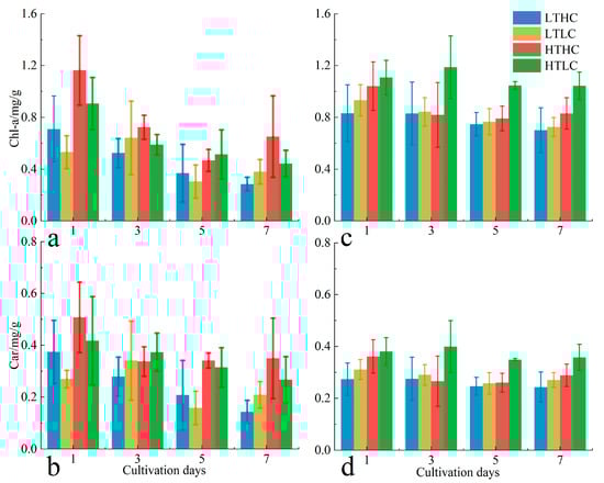 Changes in chlorophyll a (Chl-a) and carotenoids (Car) of U. fasciata ((a) Chl-a; (b) Car) and S. horneri ((c) Chl-a; (d) Car) during cultivation in different conditions. Cultivation conditions for each group: LTLC (15 °C and 1000 μL·L−1), LTLC (15 °C and 400 μL·L−1), HTHC (20 °C and 1000 μL·L−1), and HTLC (20 °C and 400 μL·L−1). The error line is the SD.