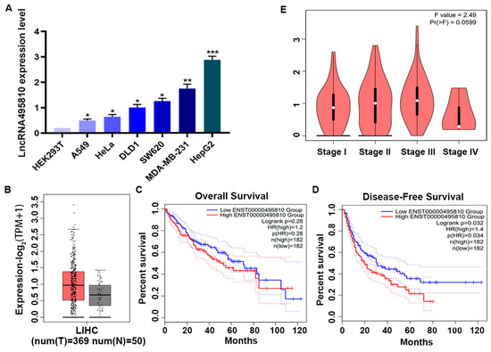 LncRNA495810 is upregulated in HCC and associated with poor outcomes in HCC patients. (A) LncRNA495810 expression level was detected by RT-qPCR in colorectal cancer, breast cancer, cervical cancer, lung cancer, and HCC cells. (B) LncRNA495810 expression in human HCC tissues (T, n = 369) and normal liver tissues (N, n = 50) based on TCGA data from GEPIA2. (C,D) Kaplan–Meier survival analysis of the correlation between lncRNA495810 expression and disease-free survival and overall survival based on TCGA liver cancer data, analyzed by the online in silico tool Kaplan–Meier Plotter (https://kmplot.com/analysis/, accessed on 18 March 2024). (E) The correlation between lncRNA495810 expression and HCC pathological stage is based on TCGA data from GEPIA2. * p < 0.05, ** p < 0.01, *** p < 0.001.