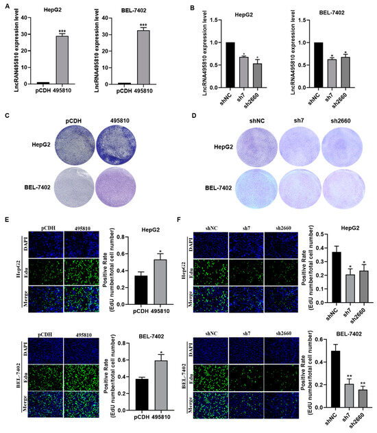 To further explore the biological roles of lncRNA495810 in HCC, HepG2 and BEL-7402 cells were transfected with lncRNA495810 overexpression or knockdown plasmid, and the transfection efficiency was detected by RT-qPCR. It can be seen that lncRNA495810 expression was remarkably restored in both cells transfected with overexpressed plasmid (Figure 2A) and that it was suppressed in cells transfected with indicated shRNAs (Figure 2B). The colony formation experiment and Edu assay were then carried out to evaluate the role of lncRNA495810 in cellular proliferation. The results showed that the number of colony-forming cells and Edu-positive cells were significantly upregulated after the overexpression of lncRNA495810 (Figure 2C,D) while they were decreased in lncRNA495810 knockdown cells (Figure 2E,F). Collectively, these data demonstrated that lncRNA495810 promoted HCC cellular proliferation.