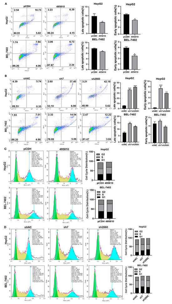 In order to investigate the effects on apoptosis and cell cycle of HCC cells, flow cytometry was used to analyze HepG2 and BEL-7402 cells overexpressing or interfering with lncRNA495810. The results showed that lncRNA495810 overexpression decreased the percentage of both late and early apoptotic cells and reduced the G1 phase arrest of cells (Figure 3A,C). In contrast, lncRNA495810 knockdown promoted the apoptosis of HepG2 and BEL-7402 cells (Figure 3B) while arresting the cell cycle in the G1 phase (Figure 3D).