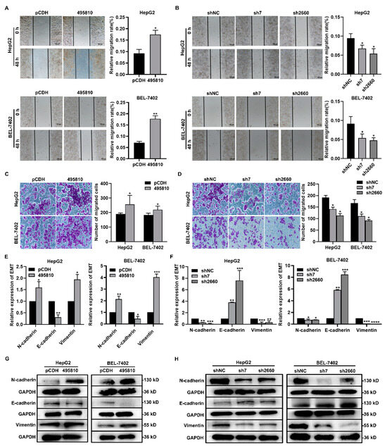 LncRNA495810 promotes the migration of liver cancer cells. (A,C) Wound healing assay (A) and migration assay (C) were conducted after transfection of empty plasmid (pCDH) and lncRNA495810 overexpression plasmid (495810). (B,D) Wound healing assay (B) and migration assay (D) were conducted after knockdown of lncRNA495810 (sh7, sh2660). The migration ability of HepG2 cells and BEL-7402 cells after lncRNA 495810 overexpression or silencing was determined by migration assay (×200). (E,G) The effect of lncRNA495810 on the EMT process of HCC cells was studied by RT-qPCR and Western blot after lncRNA495810 overexpression (495810). (F,H) After knocking down lncRNA495810 (sh7, sh2660), the effects of lncRNA495810 on the EMT process of HepG2 and BEL-7402 cells were studied by RT-qPCR and Western blot. * p < 0.05, ** p < 0.01, *** p < 0.001.