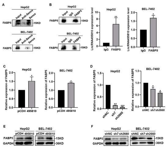 In order to elucidate the underlying mechanism by which lncRNA495810 exerted oncogenic roles in HCC, we conducted RNA pull-down combined with mass spectrometry experiments to detect proteins that interact with lncRNA495810. A total of 43 proteins that specifically interact with the lncRNA495810 sense strand were detected, as listed in Supplementary Table S1, among which, fatty acid-binding protein 5 (FABP5) caught our attention. FABP5 is reported to be highly expressed in a variety of cancers and regulates the development and progression of cancer cells including HCC through its participation in the EMT signaling pathway [20]. Consistently, we found that the expression of FABP5 in HCC tissues was significantly higher than that in neighboring normal tissues by searching the UALCAN database (Figure 5A,B). But, the expression of FABP5 was found to be little related to tumor staging (Figure 5C). In addition, the Kaplan–Meier curve showed a poor prognosis in HCC patients in the FABP5-high-expression group (Figure 5D). In summary, FABP5 may be a key player involved in the HCC process.